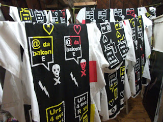 Carnival flags, drying on the line as they get printed. The design is based on Romeo & Juliet. I worked with a group of very bright, talented young people from the Garage Youth Club in Ely to develop the text messages which come from the play's text. Keith Kahn and his team of designers formulated the basic costume designs and the motifs which we used on the flags.